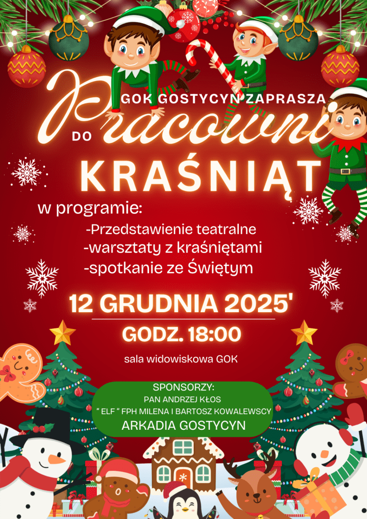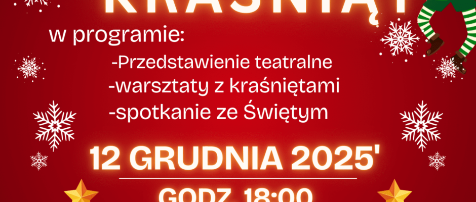 W zimowy wieczór, 12 grudnia 2025 o godz. 18:00, sala widowiskowa GOK przemieni się w świąteczną krainę pełną świątecznej magii, zapachów pierników i cichego brzęku mikołajkowych dzwoneczków. Tylko tego dnia otworzą się drzwi do świata, w którym mieszkają pracowite Kraśnięta, a każdy mały cud będzie miał wielką moc.